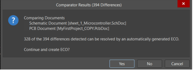A Comparator Results dialog will appear, prompting you to confirm whether to continue and create an Engineering Change Order (ECO).