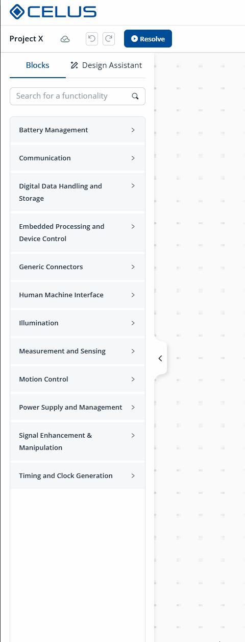 The Design Library panel, displays the list of Functional blocks and their categories available for designing an electronics project. To gain more insight into the concepts of functions and their structures, please visit the page. You can also search the name of functionality in the top searching bar, and the search term will be highlighted in grey across blocks within Library Panel. User can close the Library Panel if they tap on the handle, and can re-open it if they tap again on the handle.