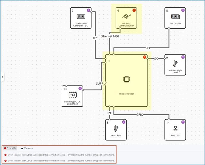 Clicking on a specific error or warning highlights the related element directly on the Design Canvas.