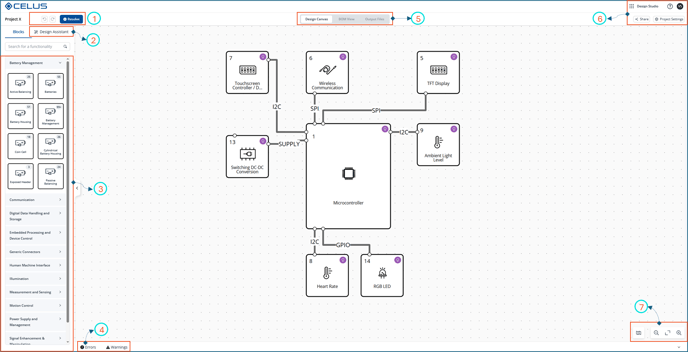 CELUS Design Canvas: 1)Undo/Redo and Resolve button 2)Design Assistant 3)Design Library Panel 4)Error/Warnings Panel 5)Navigation Tabs 6)Canvas Settings 7)View Settings
