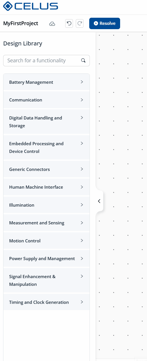 The CELUS Design Canvas is the workspace within the CELUS Design Studio where you can plan, design and execute your electronics projects seamlessly. It provides all the necessary details to expedite the development of a functional electronic product, ranging from high-level block diagrams to interconnecting multiple functional circuits on a simple whiteboard. Additionally, you can create a Bill of Materials (BoM) for your project and generate the Electronic Design Automation (EDA) files required for building your PCBs, all within a single application. Below is a step-by-step guide on how to build a project from scratch.