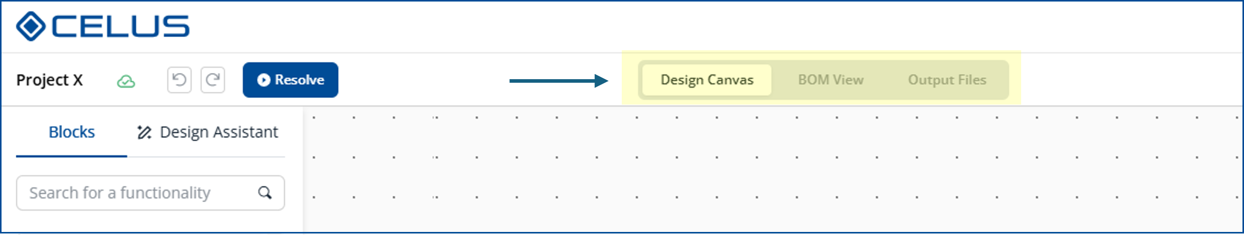 Design Studio comprises three stages: Design Canvas, BOM View and Output Files. Once you have completed filling in the details in Project Settings, the CELUS Design Canvas tab will be activated, allowing you to commence the project creation process. Upon resolving the project in the CELUS Design Canvas, the BOM view and Output Files stages will be activated for review.