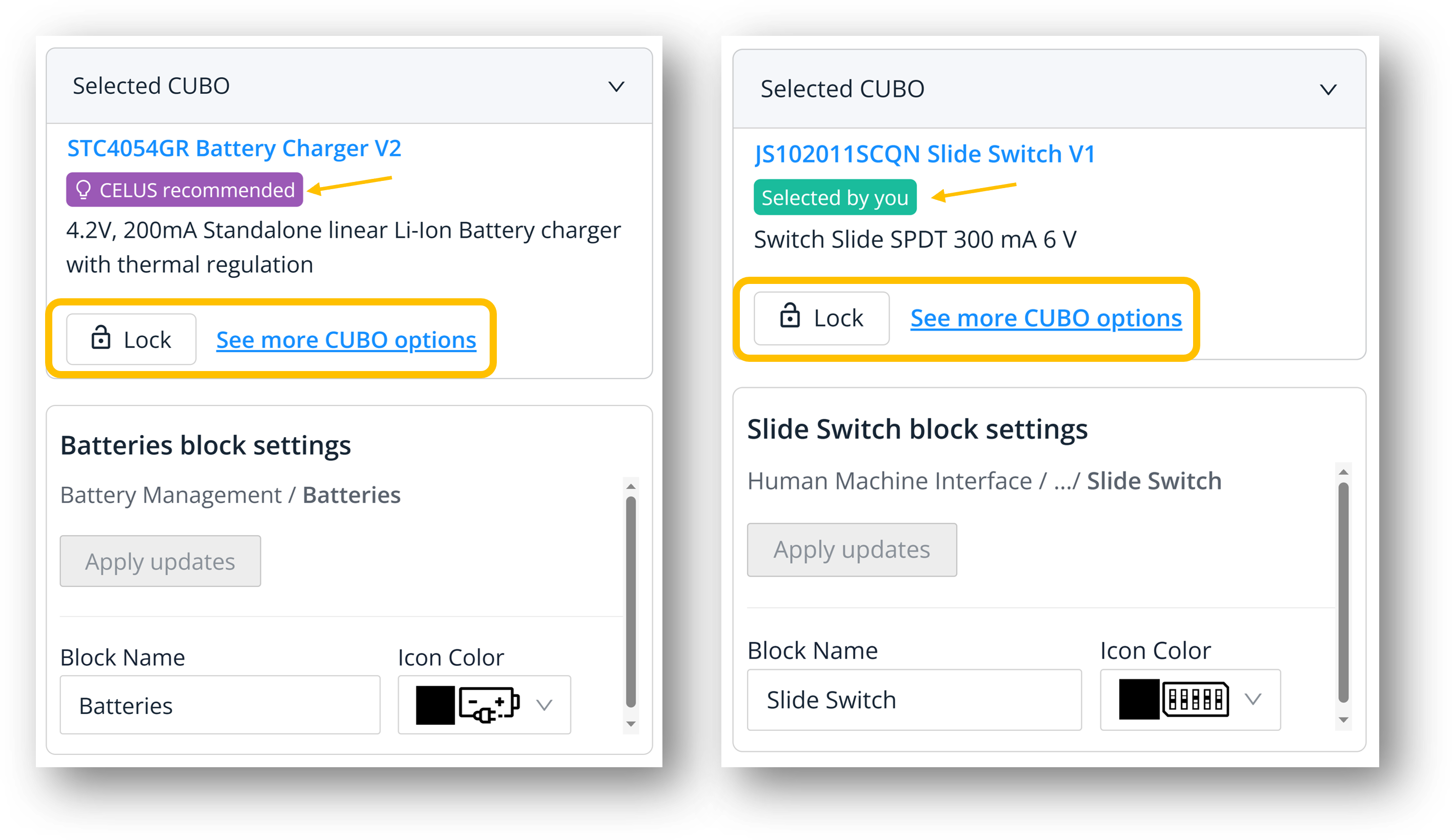 Once your project has been resolved, all Functional Blocks will be populated with at least one matching CUBO™. By default, the CELUS Design Platform automatically selects a recommended CUBO™, marked with a purple CELUS recommended tag. You can explore additional options by clicking See more CUBO options, which will open the CUBO Results screen. Here, you can review alternative CUBOs, examine their schematics and metadata, and select a preferred implementation. If desired, you can lock a specific CUBO™ directly from the results view. Alternatively, you may proceed with the CELUS-recommended option. Once you confirm your selection by clicking Lock in the Settings panel, the button status will update to Locked, and the label will change to Selected by you, indicating that a user-defined selection has been made. For a detailed walkthrough of the CUBO™ Results interface and further selection mechanisms, refer to the chapter titled Select CUBO™.