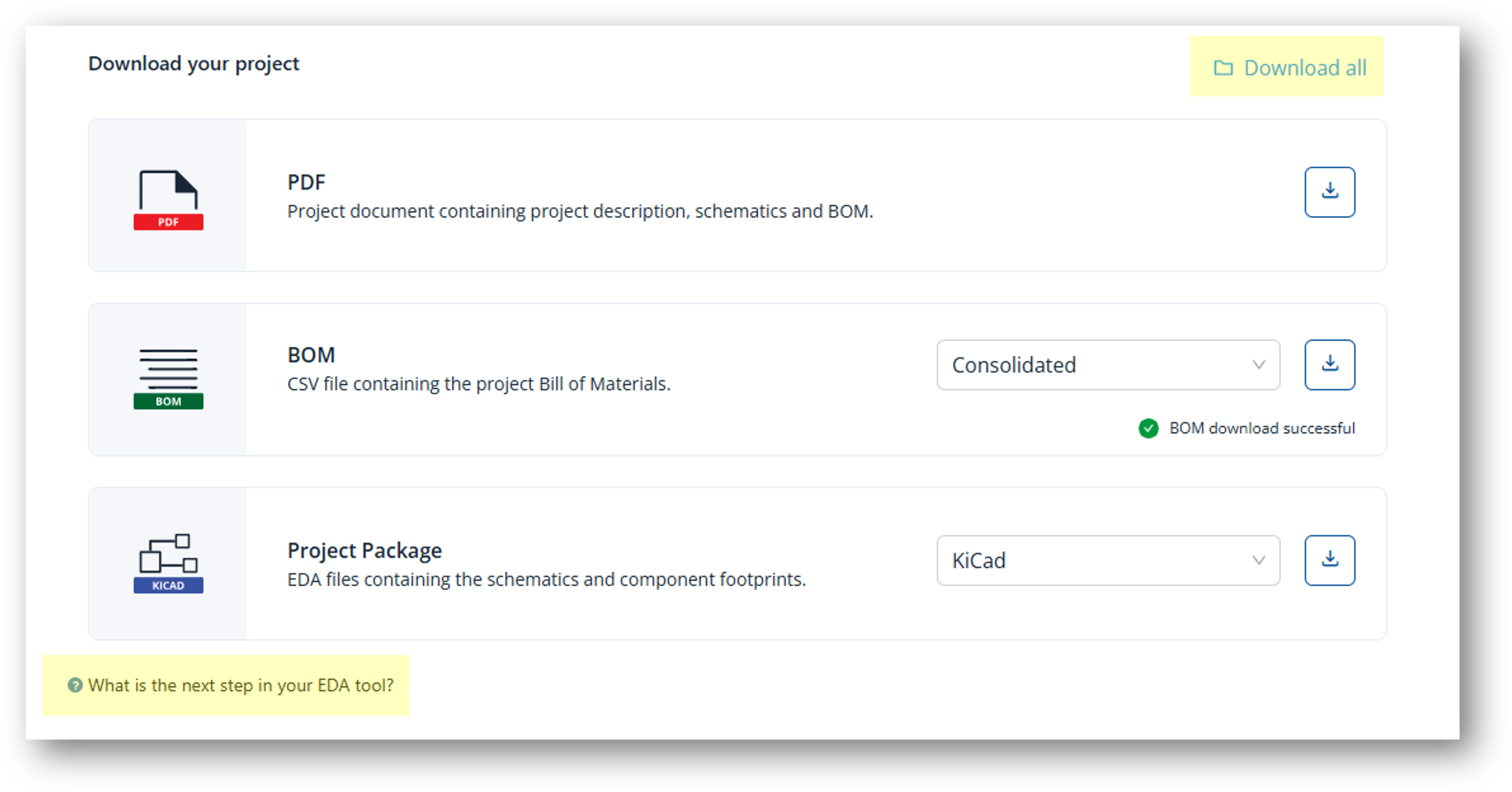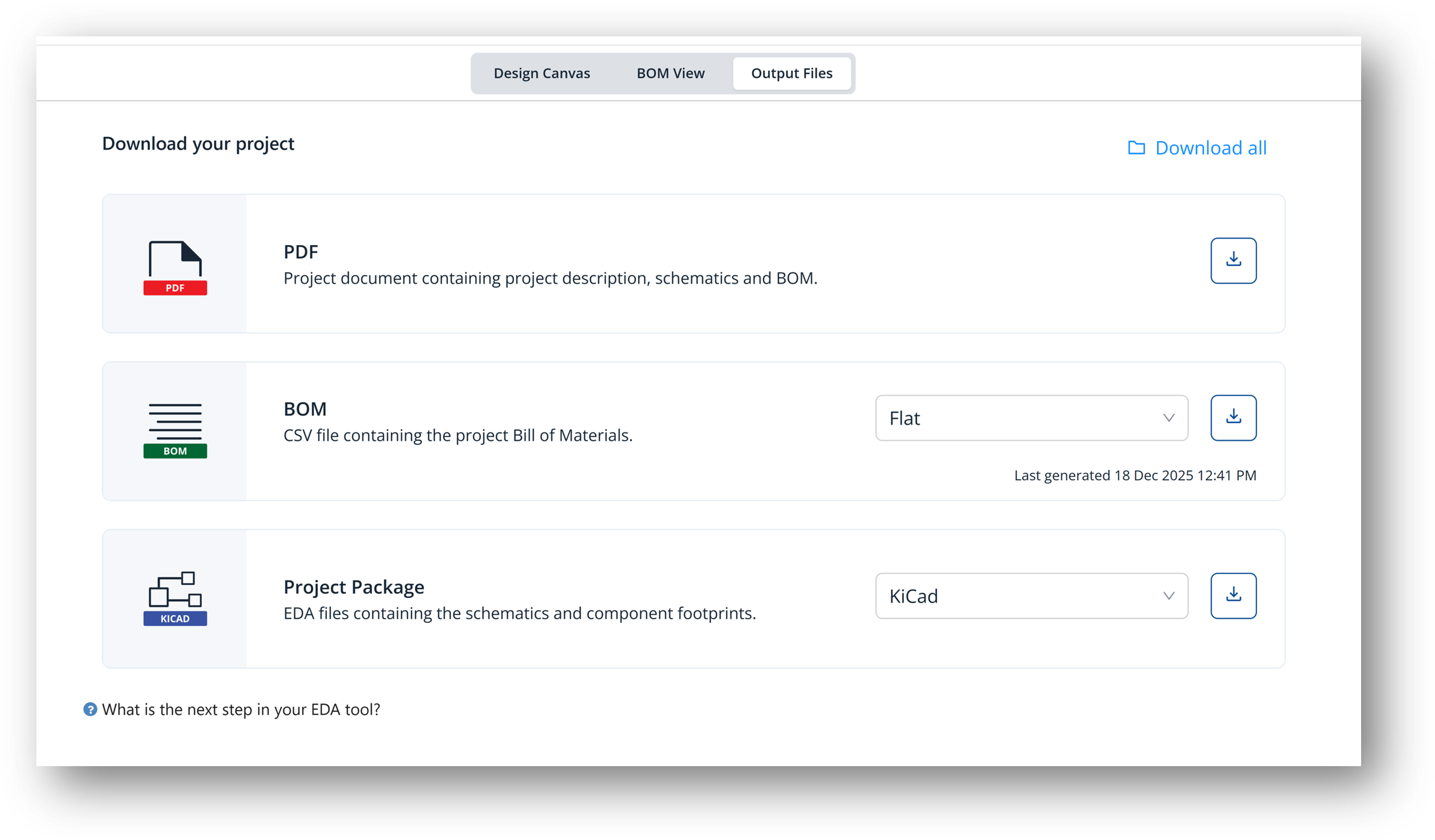 Once you have completed your project in Design Canvas and generated the BOM in BOM View, the Output Files page lets you download all your deliverables directly. You can export a PDF report with schematics and BOM, CSV BOM formats (Consolidated and Flat), and a project package for EDA tools like Altium Designer, Autodesk Eagle/Fusion, or KiCad. There is also a Download All option to get everything at once, and links to guidance on integrating these files into your preferred ECAD software.